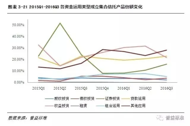 从2015年10月至2016年10月各应用类型季度变化趋势来看,其它应用领域和权益投资类产品数量和占比都呈交替上升的态势,权益投资占比在2016年二季度成立产品最多,为407款,同时占比达到最高点31.57%,在三季度数量降至348款,占比仅为21.64%,下滑至第三。其他应用类产品数量和占比在2016年二季度降至最低,成立产品301款,占比23.35%,在三季度数量增加到453款,同时占比升至27.11%,排位升至第一。贷款应用类占比前三个季度在19%-21%间变化,2016年三季度成立产品数扩大到370款,占比随之升至23.01%,以微弱优势领先权益投资类排至第二。证券投资占比2015年四季度下滑幅度很大,产品数量由581款降至118款,占比则由24.1%降至7.98%,并在2016年前两个季度微弱增长,2016年三季度增幅扩大,产品数量提高到258款,占比达到16.04%。组合应用类产品成立的产品数量在统计区间的前三个季度都在98-106款的区间内变动,占比基本保持在7.5%左右,2016年三季度产品数量下降到83款,占比也降至5.16%。债券投资在前三个季度数量和占比持续下降,2016年三季度,数量由33款回升至58款,占比增加到3.61%。股权投资类产品持续下降,数量由51款降至37款,份额由3.45%降至2.3%。租赁类产品仅在2015年四季度发行4款、2016年三季度发行1款产品。