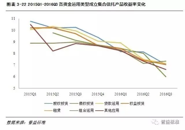 各应用类型产品预期收益率在2015年四季度都出现较大幅度降低,且都降至10%以下。除组合应用类产品在2016年三季度有回升外,其余都呈下滑态势,同比降幅也逐渐增加,统计区间内债券投资类预期收益率下降幅度最大,达到31.35%。股权投资类产品平均收益率最高,达到8.175%,贷款应用类产品平均收益率为8.15%,其他类产品平均收益率都位于8%以下,权益投资类产品7.9%,组合应用类产品7.89%,债权投资类产品7.8%,证券投资、租赁类产品平均收益率最低,分别为6.98%、6.2%。