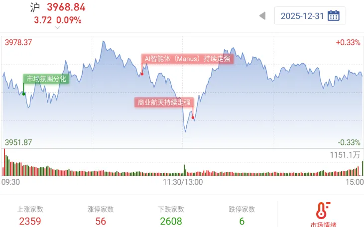 三大指数分化,上证指数横盘震荡,创业板指走弱跌超-1%,收盘两市总成交近2万亿,相较前一交易日缩量4%,涨跌家数接近持平。市场局部强势,部分题材股轮动走强。商业航天雷科防务三连板,顺灏股份涨停创趋势新高,权重中国卫星涨停六天五板,中国卫通四天二板,航天发展尾盘涨停。机器人概念泰尔股份五连板,五洲新春三连板再创历史新高,权重三花智控高位震荡,北交所天铭科技二连板。此外AI智能体(Manus)权重蓝色光标20cm涨停,南兴股份二连板,利欧股份涨停。另有芯片、有色金属、AI眼镜、海南板块等轮动。短线情绪整体修复,高位股雷科防务、顺灏股份快速涨停,中国卫星六天五板,航天发展四天三板,连板股大业股份大长腿六连板。