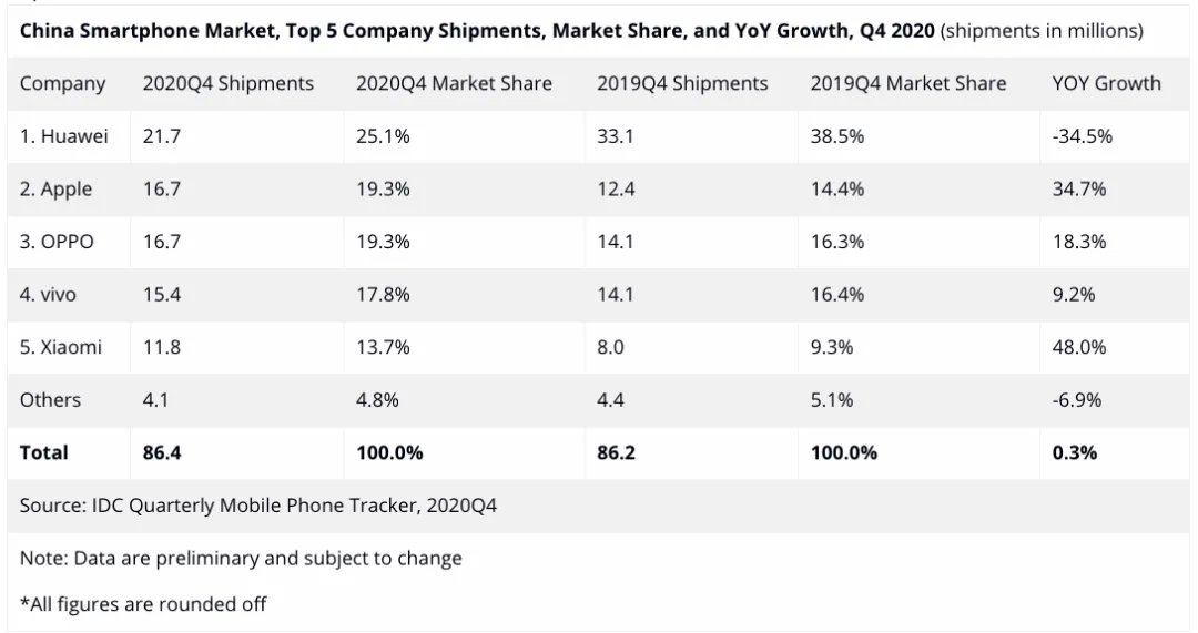首先是2020年Q4第四季度10-12月我国国内智能手机市场份额。TOP5依次是①华为+荣耀 2170万台 25.1%市场份额 是TOP 5唯一下滑(流失达34.5%)的厂商;②苹果 同比+34.7%;③OPPO