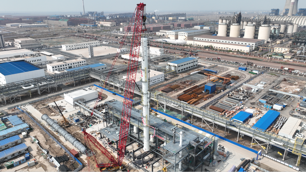项目大型吊装设备共计9台,总重925.6吨,其中首次吊装的设备是脱水塔。该设备直径2.8m,高64m,设备净重量123t,附塔设施重量约32t,设备吊装总重量为155t。脱水塔设备的吊装顺利完成,标志着山东滨华甲胺项目大型吊装工程正式拉开序幕。