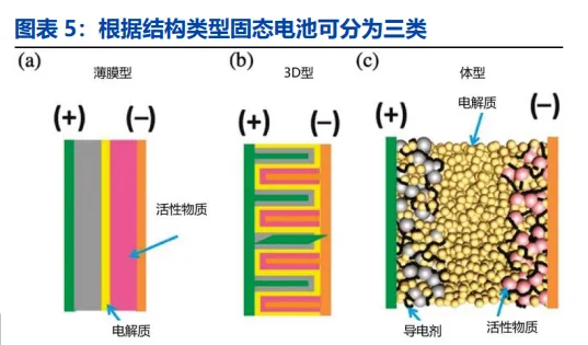 分类:1)锂电根据电解液含量可分为四类:液态、半固态、准固态和全固态。液态锂电电解液含量超 25wt%,半固态/准固态电池保留 10wt%以下液态电解液,全固态不含液态电解液。2)根据电解质种类可将固态电池分为四类。主要包括氧化物、硫化物、聚合物和卤化物。3)根据结构类型可将固态电池分为三类。主要包括薄膜型、3D 型和体型。受限于技术水平,目前以采用氧化物、聚合物的半固态电池为主,体型硫化物全固态是趋势。