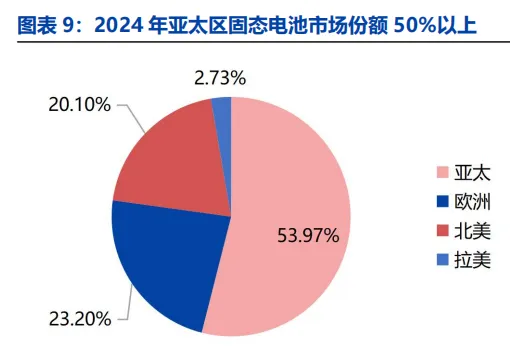 2024 年亚太区占据固态电池市场规模的50%以上。受益于中国完整的锂电产业链、政策支持力度和新能源车等需求,亚太地区固态电池市场份额最高。