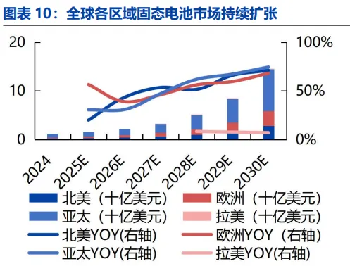 全球各区域固态电池市场规模持续扩张。据GrandViewResearch预计,亚太、北美和欧洲等主要市场 2025-2030 年维持在 20%以上的增速,规模持续增长。