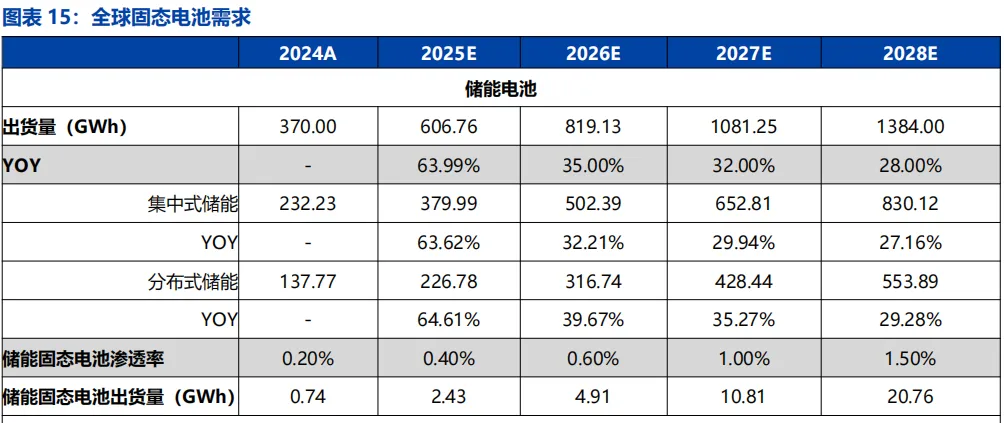 储能:储能板块电芯成本敏感度较高,当前储能以配套示范性项目为主,预计 2030 年固态电池在储能的渗透率在 2%左右。