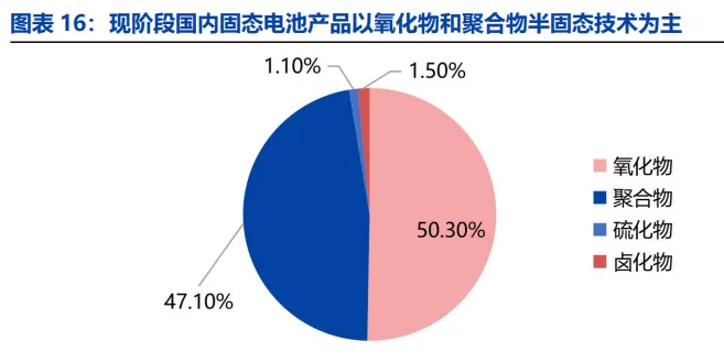 现阶段国内固态电池产品以氧化物和聚合物半固态技术为主。2024 年国内聚合物及氧化物固态电池出货量占比在 97%以上,硫化物或卤化物固态电池占比不足 3%。