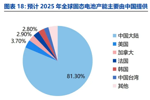 全球固态电池产能中国占比最大。中国受益于全产业链优势和政策支持,具有全球各主要区域最大固态电池产能,2025 全球固态电池产能预计中国占比 80%以上。