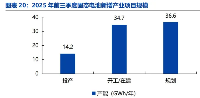 国内固态电池产业在建和规划产能高。2025Q1-Q3,共有 41个固态电池产业项目更新动态,新增年产能总计 85.5GWh,其中新增规划产能约为 36.6GWh,在新增产业项目中占比达 42%以上。