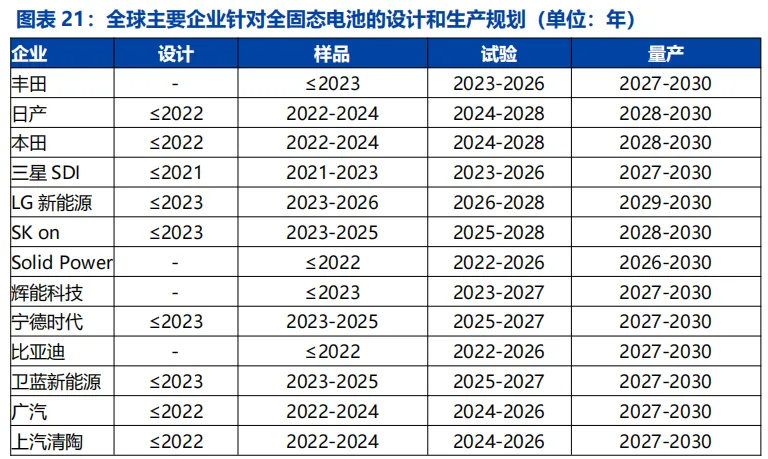 全球主要企业针对固态电池具有清晰的研发和量产规划,2027 年将是关键节点。中美日布局较早,比亚迪,辉能科技,SolidPower和丰田率先制样(2021年)。SolidPower规划 26 年底实现全固态电池量产,丰田,三星,广汽,清陶等规划 27 年初实现量产。