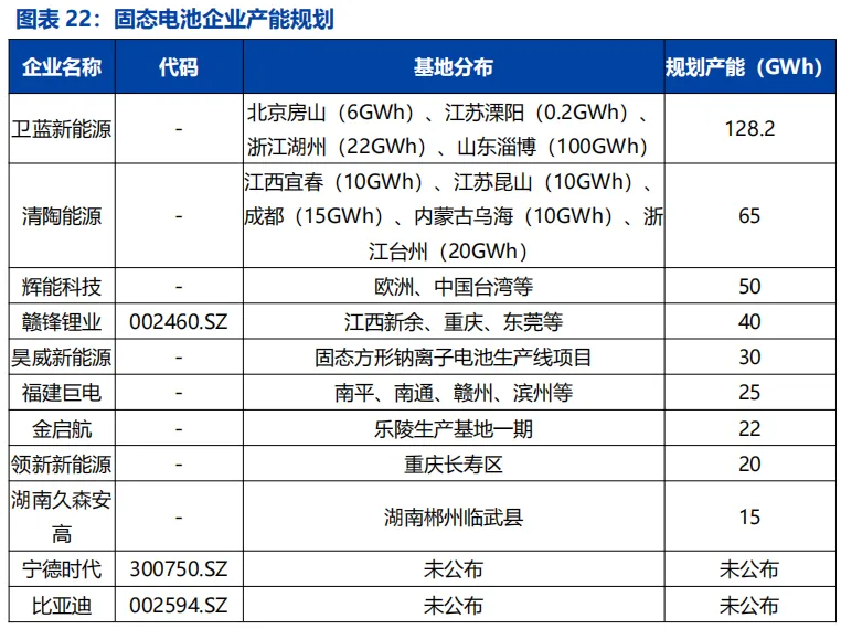 固态电池产能主要集中于卫蓝能源和清陶能源等非上市公司,上市公司中赣锋锂业产能规划明确。据统计,卫蓝新能源规划产能达到128.2GWh,清陶能源规划产能达到65GWh,在国内企业中处于前列。国内上市公司中赣锋锂业规划产能达到 40GWh,有望在电池固态化进程中率先实现产业化落地并受益。