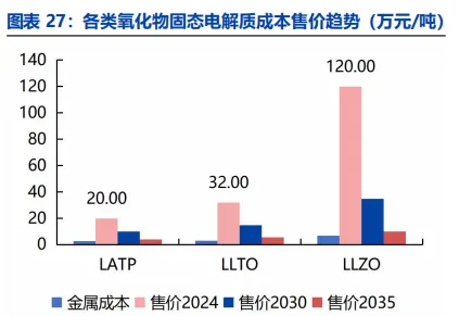 电解质售价呈下降趋势。氧化物中LLZO电解质的售价最高,2024 年为 120 万元/吨,预计 2035 年降至约 10 万元/吨。