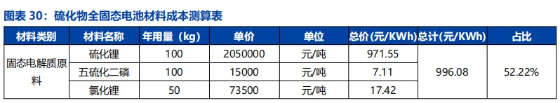 硫化锂是硫化物全固态电池的主要成本来源。在硫化物全固态电池成本构成中,固态电解质成本占比最高,可达 50%以上,其中硫化锂在硫化物固态电解质生产成本中占比最高,因此,硫化锂降本是降低硫化物全固态电池成本的关键。