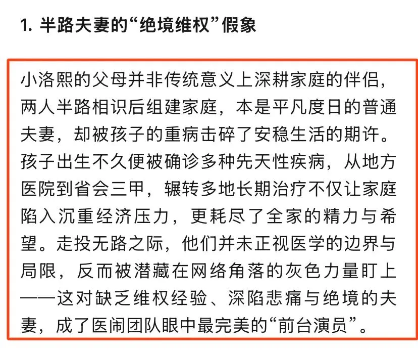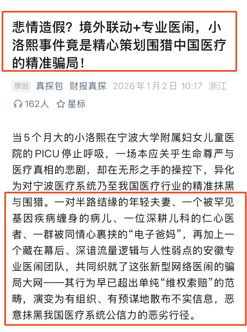 2026年1月2日,这个“财报真探”写了篇文章,直接把小洛熙事件扣上了“境外联动+专业医闹”的超级大帽子,开始对小洛熙父母揭老底。