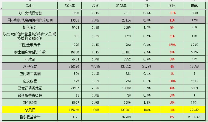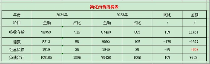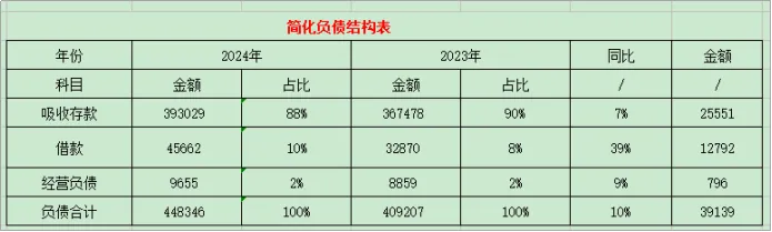 1、工商银行吸收存款的能力在下降,通过简化负债结构表,2024年高成本的借款金额同比增加39%,而低成本的存款仅增加7%。
