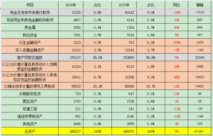 3、再看资产端。2024年末总资产48.8万亿,同比增加9%,增加了4万亿。