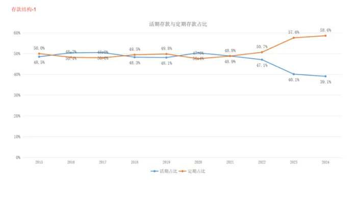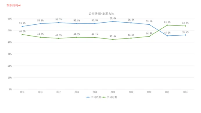 4是公司存款中定期与活期的比例,2023年开始出现了一个明显的变化,公司存款中定期存款的比例超过活期存款,2024年继续延续。