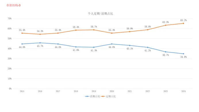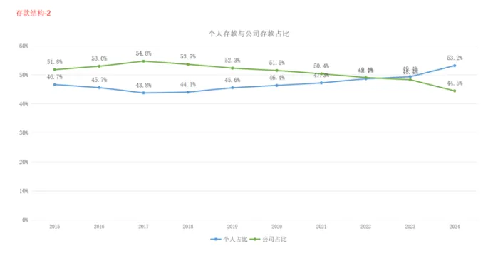 2是个人存款与公司存款占比,2017年是拐点,个人存款占比从2017年持续上升,到2024年达到53%,公司存款占比持续下降。