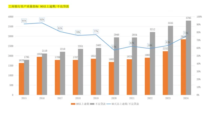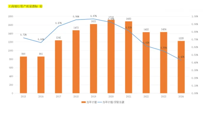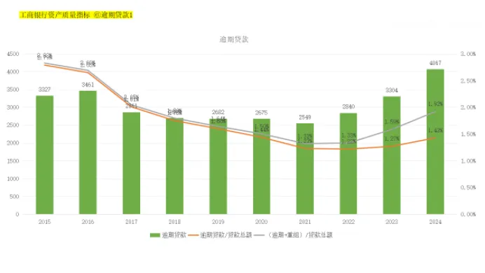 从2022年开始,无论是新增的逾期贷款还是新增的重组贷款都幅度增加,侧面印证了工商银行通过重组贷款、少计提信用减值损失减少了不良贷款的总额,使得不良贷款率由2023年的1.36%下降至2024年的1.34%,因为逾期贷款金额是真实的数据,所以真实的情况是工商的银行的资产质量是在恶化的。