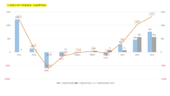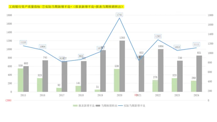 仅看报表的当期的新增不良贷款,2024年比2023年是减少的,由323亿减少至323亿;真实的新增不良还应该考虑当期核销转出,因为核销转出会减少不良贷款总额,所以真实的新增不良贷款是增加的,由2023年的1053亿增加至2024年的1111亿。
