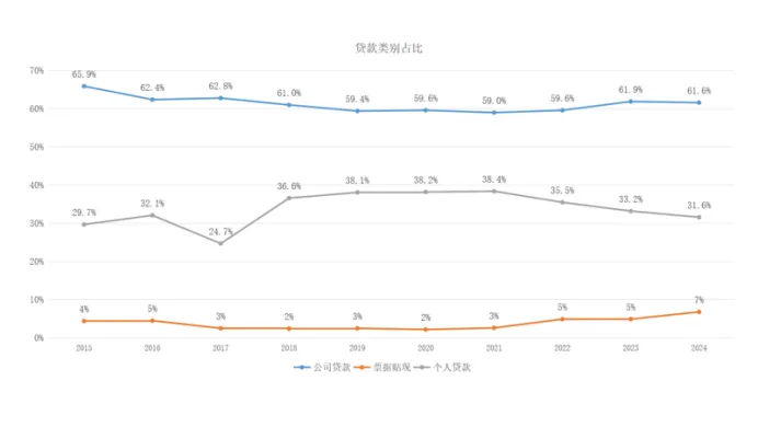 工商银行占比最大类别的贷款为公司贷款,其次是个人贷款,且个人贷款占比下降,票据贴现占比提升。