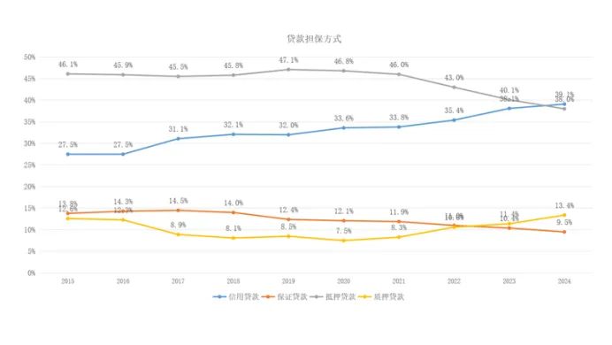 贷款担保方式上,信用贷款占比持续上升,并在2024年末成为占比最大的类别,抵押贷款占比持续下降,这个趋势和招商银行发展一致。