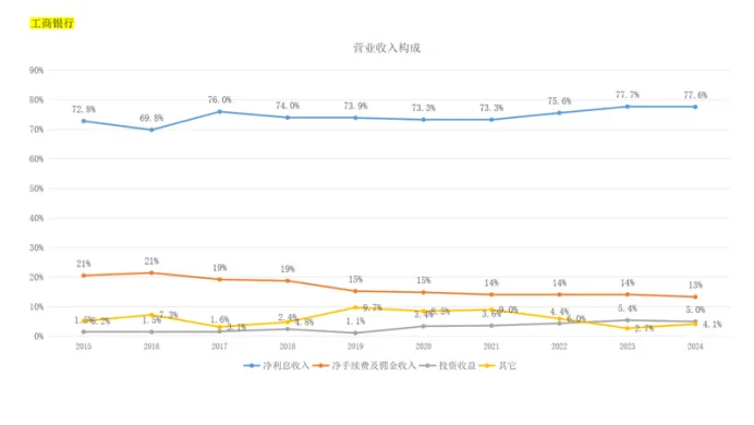 1、工商银行营业收入构成中,占比最大的是净利息收入,占比78。
