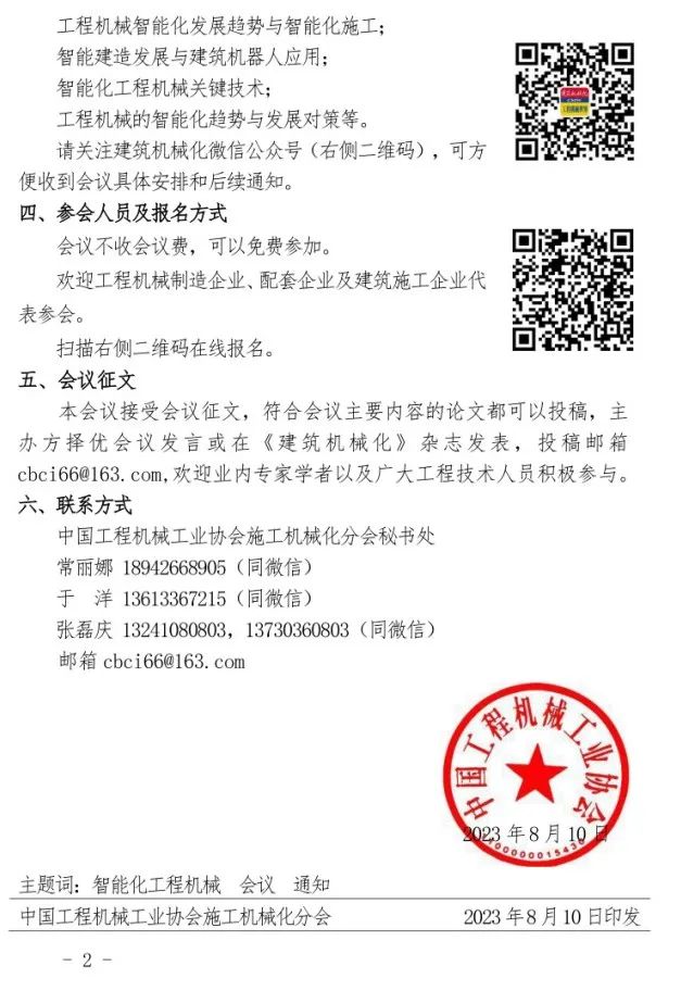 本会议接受会议征文,符合会议主要内容的论文都可以投稿,主办方择优会议发言或在《建筑机械化》杂志发表,投稿邮箱cbci66@163.com,欢迎业内专家学者以及广大工程技术人员积极参与。