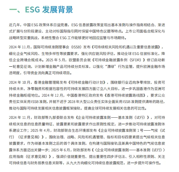 企业管理层面:ESG 报表成为 “第四张报表”,通过货币化量化环境与社会影响,辅助 “双重重要性” 分析,帮助企业精准识别风险短板与价值增长点。 投资决策层面:ESG 价值因子有效性显著,6 项核心核算因子 IC 均值超 2%,基于 ESG 风险机遇价值构建的指数累计超额收益达 57%,为可持续投资提供新工具。 行业实践层面:金融行业聚焦绿色金融、普惠金融,2024 年绿色贷款余额达 36.6 万亿元;实体行业侧重低碳转型,有色金属、石油石化等行业水资源使用强度下降超 15%。