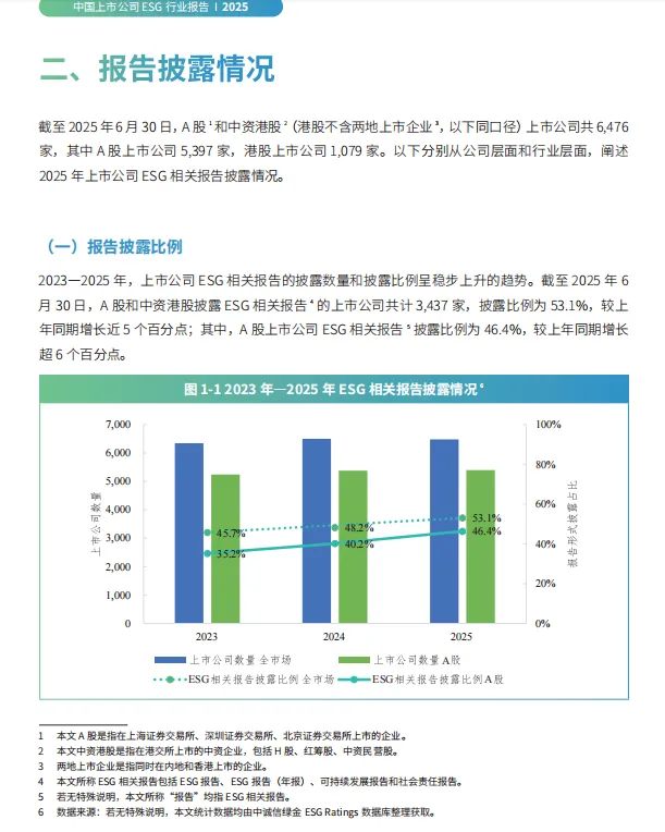 中国上市公司协会《2025 中国上市公司 ESG 行业报告》与《中国上市公司 ESG 价值核算报告(2025 年)》核心结论显示,我国上市公司 ESG 发展已进入 “标准化披露 + 价值化核算” 双轮驱动阶段。ESG 报告披露率突破 54%,银行业、非银金融业披露率居前(分别达 98.65%、88.14%),环境与社会关键指标披露质量显著提升;ESG 价值核算实现重大突破,近 60% 上市公司呈现 ESG 机遇显现,货币化核算体系为企业决策、投资配置、政策制定提供了量化支撑,推动 ESG 从合规要求转向价值创造核心工具。