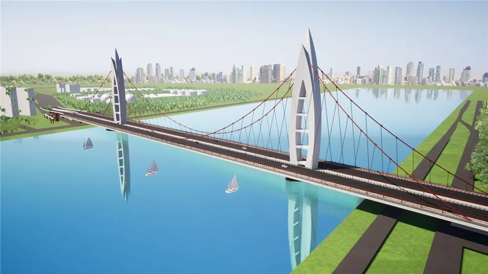 西安市会展中心外围提升改善道路PPP项目全长约8.67km,总投资约21.3亿元,建设期2年,运营期13年。其中,建材北路项目桥梁段全长1054.18m,主桥采用空间双索面自锚式悬索桥,主跨300米、主塔高123米,为世界最宽空间自锚式悬索桥,单个索鞍重达250t,索鞍加工、安装难度也为国内之最。本项目是2021年8月全运会顺利举办的重要交通通道,政治意义重大。