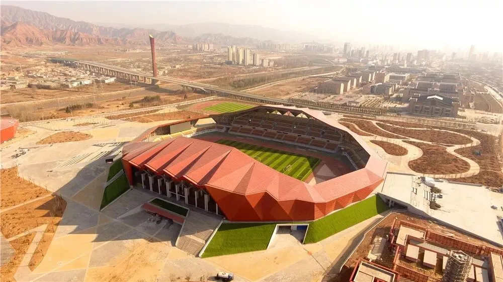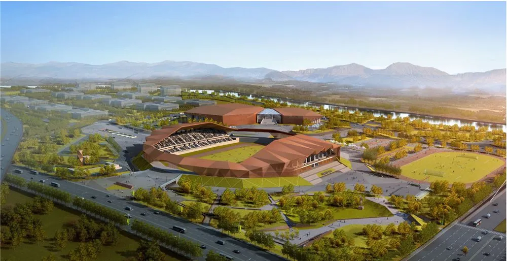 海东体育中心项目位于海东市乐都区职教城片区。总用地面积232453㎡,总建筑面积63345㎡。