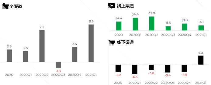 尼尔森IQ数据显示,线上渠道推动快消品整体增长,线下渠道出现复苏。2021年第一季度快消品全渠道销售额增长8.5%,大幅高于上一季度的3.4%。其中,线上渠道仍保持双位数的增长,增幅14.1%,上一季度为增长18.8%。线下渠道增长6.2%,上一季度为下降4.9%。