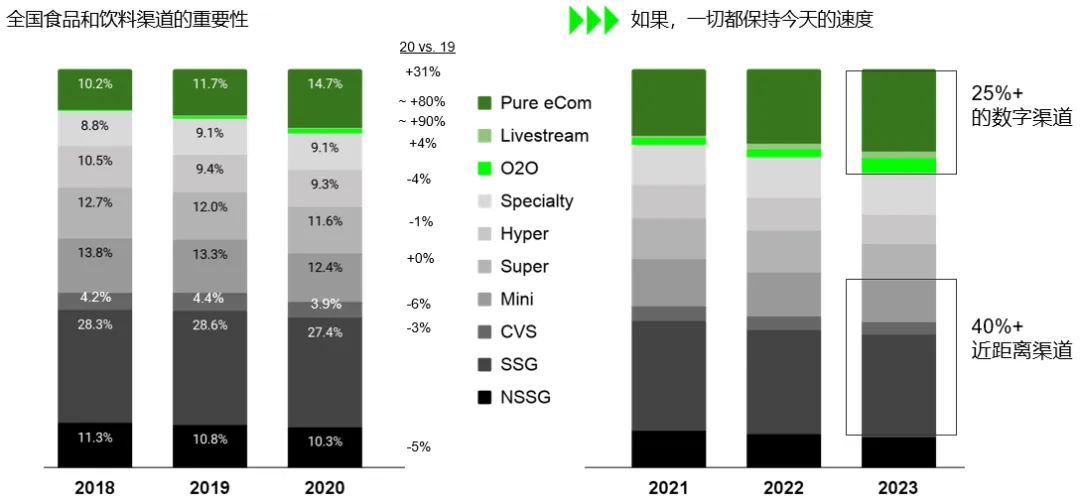 尼尔森IQ研究显示,消费者光顾的消费渠道呈上升趋势,2020年消费者平均光顾渠道数为5.4,高于2019年的5.0。新兴渠道如O2O、电商和社区团购正在受到消费者追捧。2020年电商的渠道渗透率从2019年的34%升至47%,O2O从22%升至33%,社区团购从3%升至16%。以食品饮料为例,2020年纯电商、直播和O2O的渠道重要性较2019年依次增长31%、80%和90%,如果该增长趋势保持不变,2年后数字化渠将占据25%以上的市场。