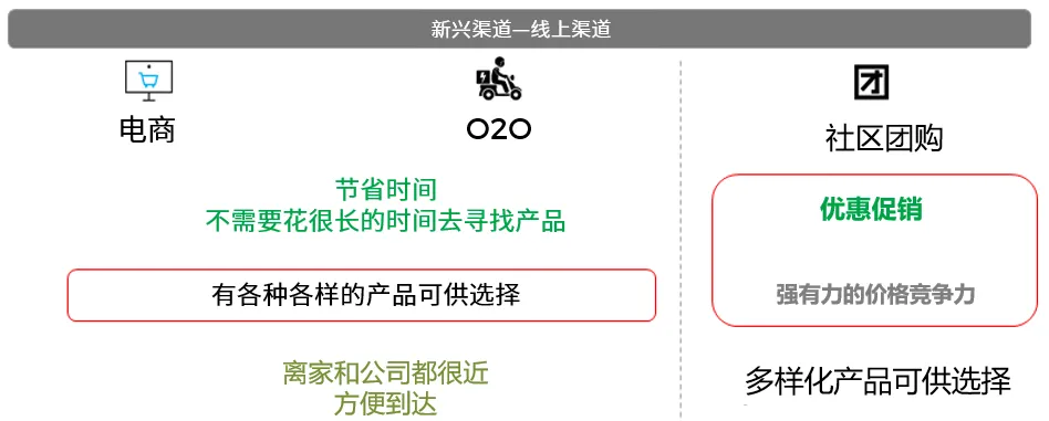 消费者选择新兴渠道的原因各有不同,但产品的丰富多样性是电商、O2O和社区团购消费者都关注的因素。此外,消费者选择社区团购更多是因为促销力度大和价格有优势。