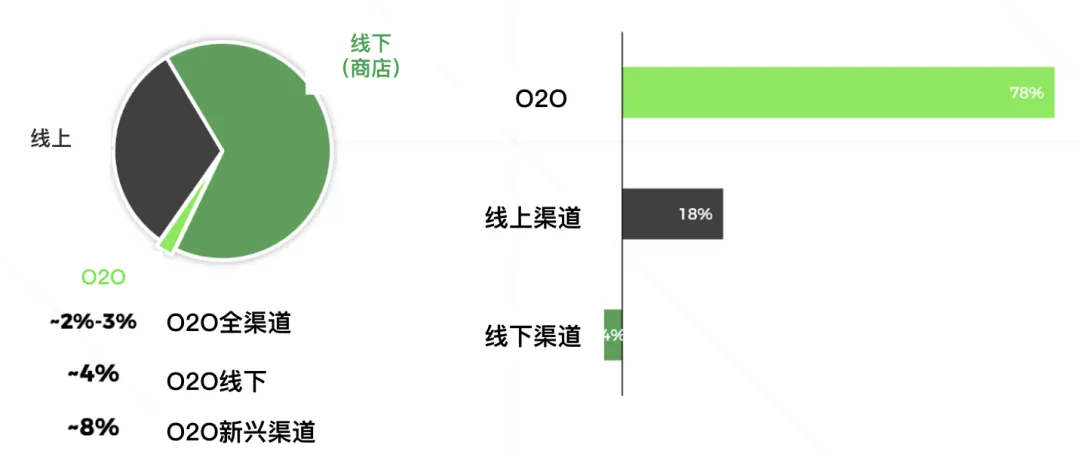 O2O目前的渠道重要性虽然较低,但发展前景可观。尼尔森IQ研究显示,新冠疫情后,用户使用O2O渠道的购物粘性显著增加。O2O渠道的购物频率在疫情前为1.7,疫情后达到3.4,增长了一倍。在60个快消品类中,O2O销售额目前在全渠道的占比约为2%-3%,但其增长势头迅猛,2020年下半年,O2O销售额较上年同期增长78%,相比之下,线上渠道增长18%,线下渠道则下降4%。
