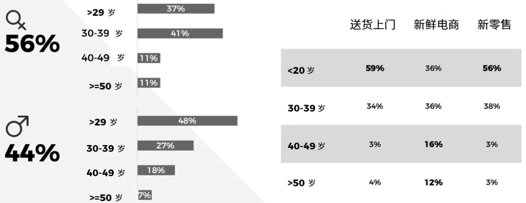 从用户来看,O2O整体偏向更具消费潜力的年轻人群。O2O的女性用户中78%为40岁以下,男性用户中75%为40岁以下。此外,不同商业模式背后各自具备不同优势细分人群。比如,配送到家和新零售模式50%以上的用户为30岁以下人群,40岁及以上人群所占比例较低(配送到家7%,新零售6%),新鲜电商相对更吸引中老年人,40岁及以上人群的占比达到28%。