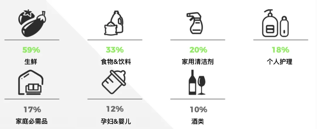 从品类来看,生鲜在O2O渠道的渗透率最高,2020下半年达到59%。除生鲜外,多个品类在O2O渠道也占据较高的渗透率,需整体重点关注,比如食品和饮料(33%)、家庭清洁用品(20%)、个护(18%)、家庭必需品(17%)、母婴(12%)和酒类(10%)。此外,O2O渠道整体品类格局集中度较高,在60个快消品类中,前20%的品类占到了整体O2O销售额的90%。