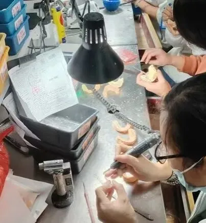 在工作人员的带领下,我们参观了新致美义齿公司的生产车间。车间内设有多个生产区域,包括铸造、打磨、上色、质检等。同学们认真观摩了各个生产环节,对义齿制作流程有了更直观的了解。