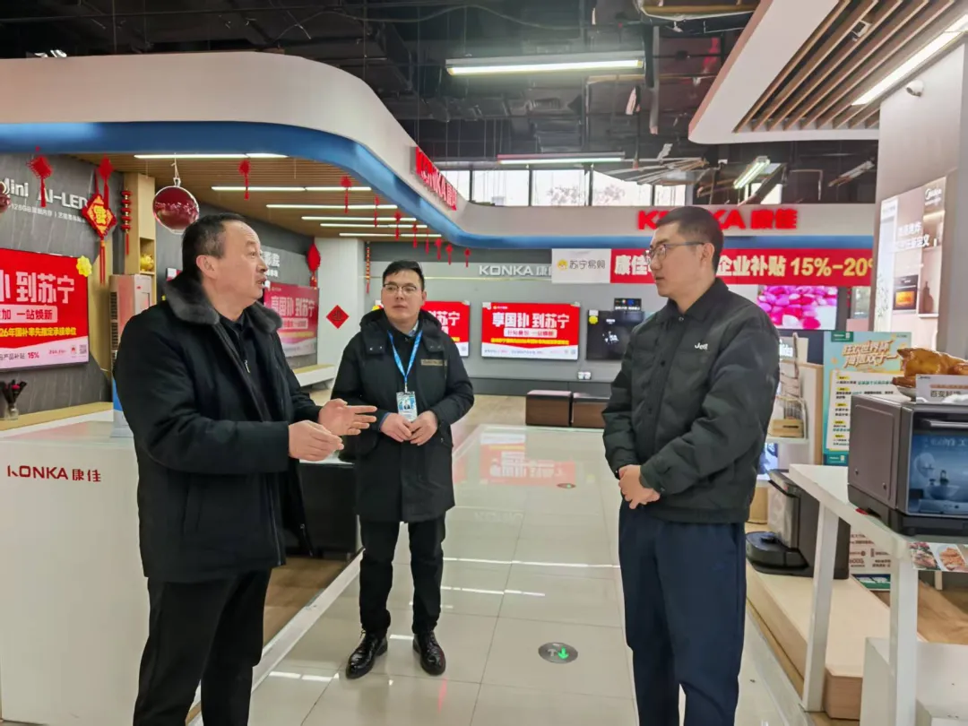 走进宿州苏宁易购门店,重点围绕 2026 年家电以旧换新政策落地情况展开调研。崔庆民详细询问补贴申领流程、旧机估值标准及智能家电销售数据,重点了解冰箱、洗衣机、空调等 6 类补贴品类的供应及销售情况。得知门店严格执行全国统一补贴标准,对一级能效产品按售价 15% 给予补贴,单件最高补贴 1500 元,同时提供“上门回收—送新拖旧” 等一体化服务给予充分肯定。并要求企业要充分做好1月3日上线的准备,进一步扩大政策宣传覆盖面,优化补贴申领审核流程,重点推广绿色智能家电向农村地区延伸,让政策红利精准触达城乡各类消费群体。