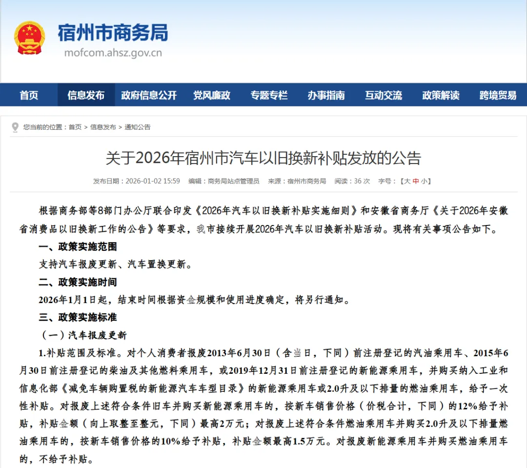 宿州市2026年汽车报废更新、汽车置换更新、家电以旧换新、数码和智能产品购新补贴活动已全面启动,欢迎广大市民和市场主体积极参与。全市商务部门将持续强化服务保障和监管引导,健全部门联动工作机制,精准落实各项扶持政策,严厉打击骗补套补、先涨后补等违法违规行为,及时协调解决企业发展难题,全力推动商贸领域安全有序发展,为全市经济社会高质量发展注入强劲动力。