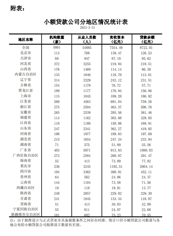 截至2023年3月末,全国共有小额贷款公司5801家。贷款余额8722亿元,一季度减少385亿元。