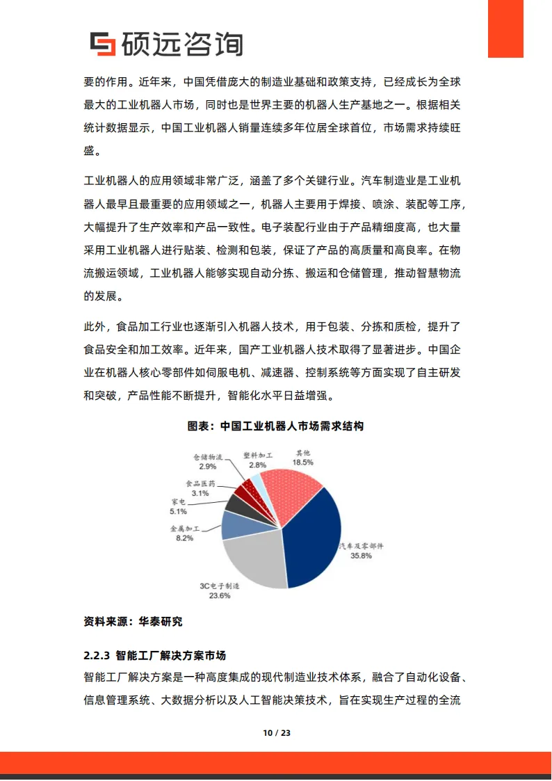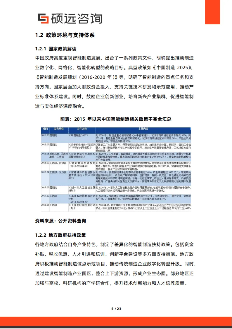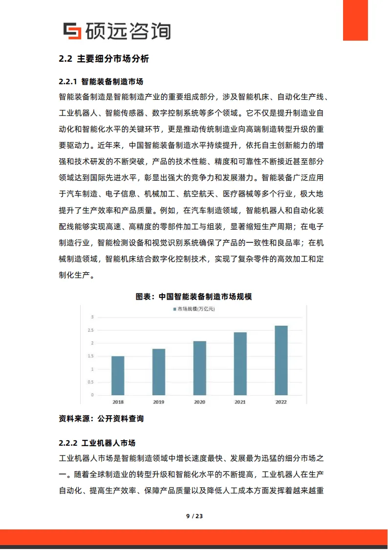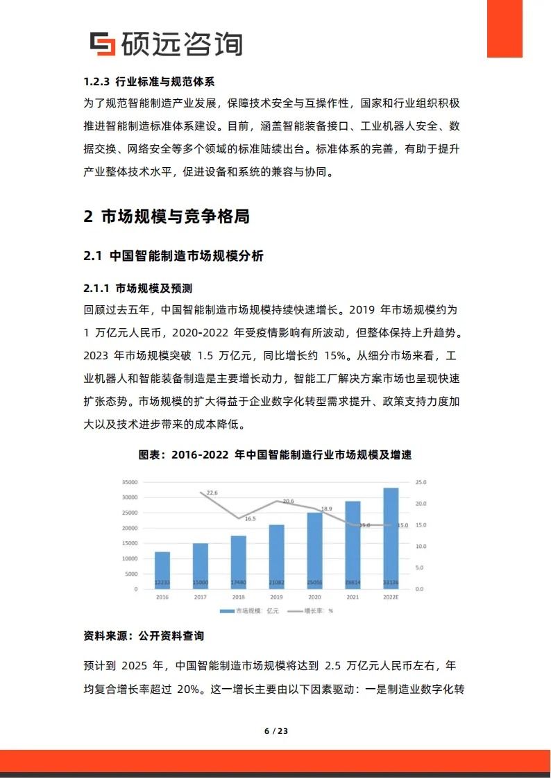 中国智能制造市场规模持续高速增长,2023 年突破 1.5 万亿元,预计 2025 年将达 2.5 万亿元,年均复合增长率超 20%。市场驱动力主要来自政策支持、企业转型需求与技术成本下降:国家层面出台《中国制造 2025》等政策,从资金、标准等多方面提供保障;地方政府推出补贴、税收优惠等差异化扶持措施;企业为应对成本压力与市场变化,数字化转型意愿强烈。细分市场中,智能装备制造、工业机器人、智能工厂解决方案为核心增长引擎,应用覆盖汽车制造、电子信息、航空航天等多个领域,长三角、珠三角等区域形成产业集聚效应。