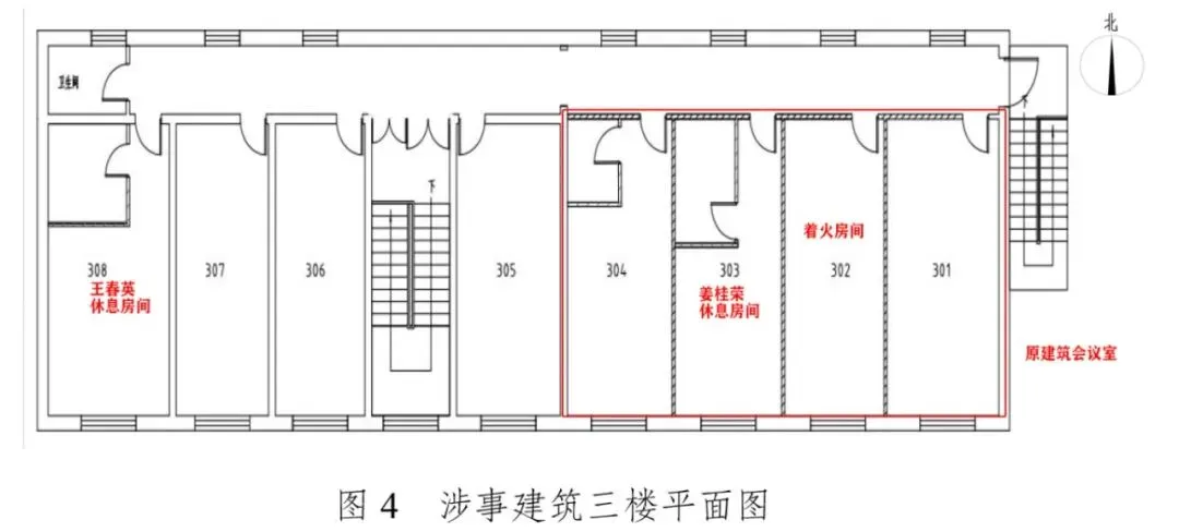21时37分,303室休息的姜桂荣被异响惊醒,发现停电,门外查看发现走廊有烟(起火后时隔22分钟),返回室内添加衣服后走道302门口,打开发现着火,立即跑到305对面的配电盘处,关闭部分空开,随后返回302,用手拖出带火的电视机,从室外楼梯抛出;