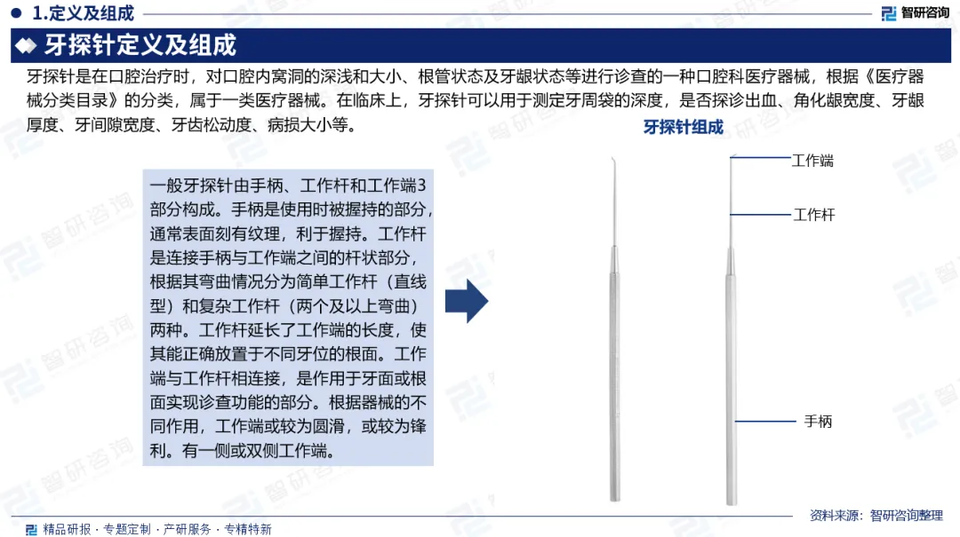 产品构成:牙探针是在口腔治疗时,对口腔内窝洞的深浅和大小、根管状态及牙龈状态等进行诊查的一种口腔科医疗器械,根据《医疗器械分类目录》的分类,属于一类医疗器械。一般牙探针由手柄、工作杆和工作端3部分构成。