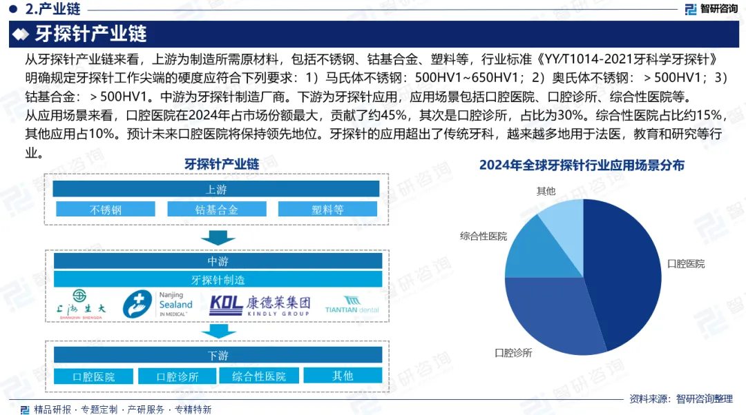 产业链:牙探针产业链上游为制造所需原材料,包括不锈钢、钴基合金、塑料等,牙探针工作尖端的硬度应符合下列要求:1)马氏体不锈钢:500HV1~650HV1;2)奥氏体不锈钢:>500HV1;3)钴基合金:>500HV1。中游为牙探针制造厂商。下游为牙探针应用,应用场景包括口腔医院、口腔诊所、综合性医院等。