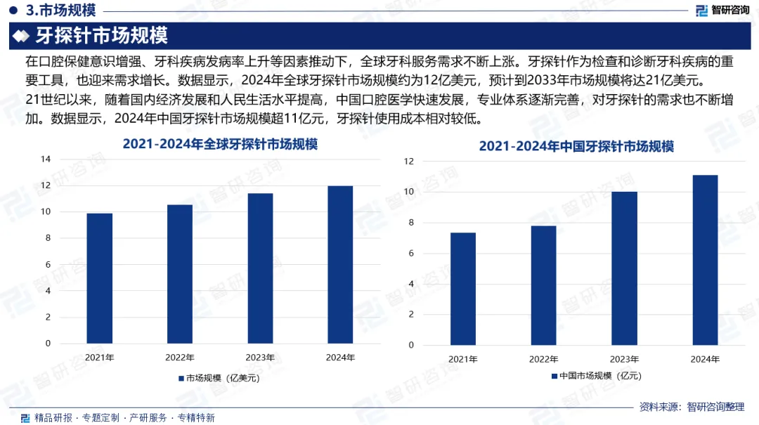 中国市场规模:21世纪以来,随着国内经济发展和人民生活水平提高,中国口腔医学快速发展,专业体系逐渐完善,对牙探针的需求也不断增加。数据显示,2024年中国牙探针市场规模超11亿元,牙探针使用成本相对较低。