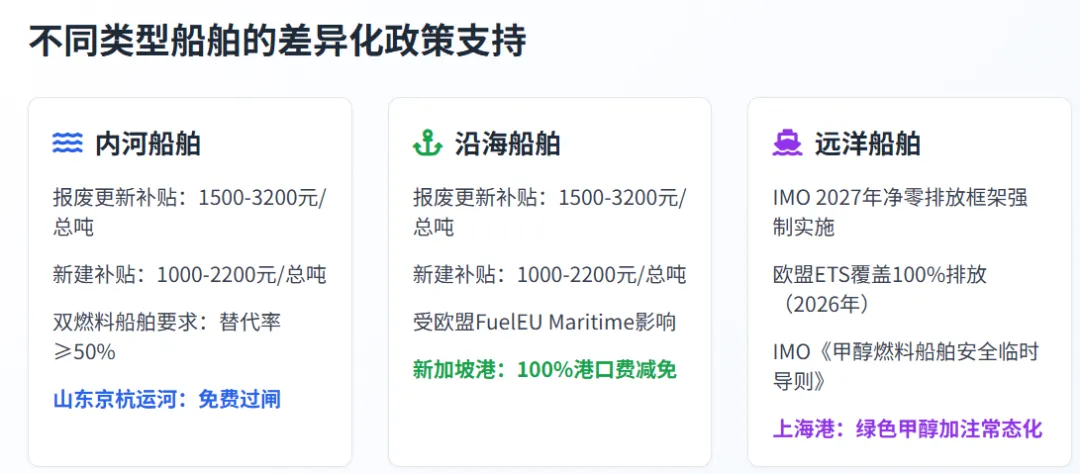 多层次体现在从国际组织到地方政府的四级架构。IMO 提供国际规则框架,各国制定国家战略,地方政府出台实施细则,港口提供具体优惠,形成了完整的政策体系。多工具体现在财政补贴、税收优惠、金融支持、监管要求等多种政策工具的综合运用。差异化体现在针对不同船型、不同地区、不同发展阶段采取了差异化的政策措施。