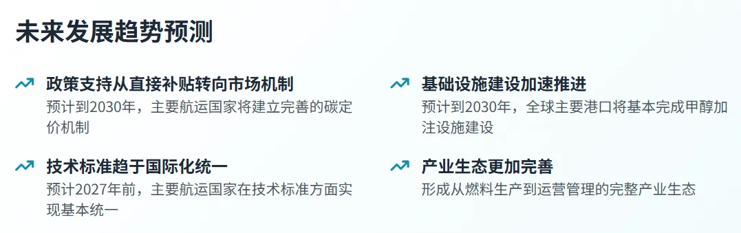 技术标准将趋于国际化统一。随着 IMO 净零排放框架的实施,各国将加快技术标准的国际化进程。预计在 2027 年前,主要航运国家将在甲醇船舶的技术标准、检验要求、船员培训等方面实现基本统一,为甲醇船舶的全球运营创造便利条件。