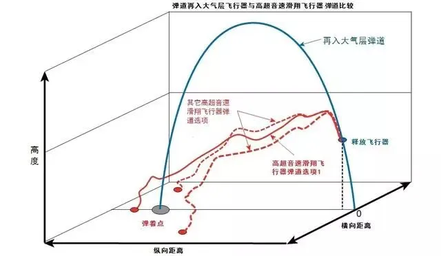 ①弹道截然不同。 高超音速滑翔飞行器从大气层“顶部”(40至100公里高度)“滑翔“至目标。即使在大气稀薄的大气层,在设计时候也考虑了提供与其重量相等的浮力,使其可以速度可以达到高超音速。高超音速滑翔飞行器典型的运用概念就是用弹道导弹将其发射并在合适的高度、速度和航迹角释放,使其可以滑翔至击中目标。初始释放条件由计划弹道(纵向距离和横向距离)和飞行器比如升力和阻力决定。高超音速滑翔飞行器与过去开发的机动再入大气层飞行器不同。