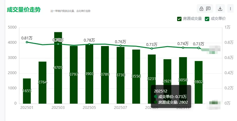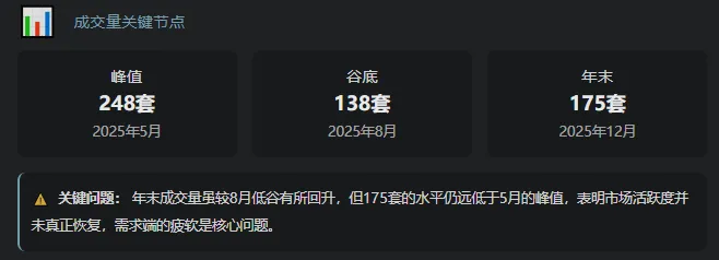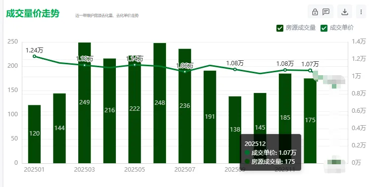 成交量在5月达到248套峰值后,于12月回落至175套。市场在年中短暂回暖后,年末因信心不足而再度降温,购房者观望情绪浓厚,去化压力显著增加。